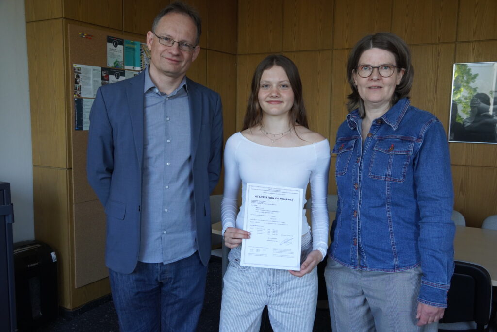 In diesem Turnus nahm Clara Braune (9c) erfolgreich an der DELF-Prüfung teil. Sie erwarb entsprechend den Leistungsstufen des europäischen Referenzrahmen ein DELF-Diplom in der Niveaustufe A2. Auch unser Schulleiter Herr Dr. Möller und ihre Französischlehrerin Frau König gratulierten Clara sehr herzlich zu dieser bestandenen Leistung. Text: Kn, Foto(s): Gb