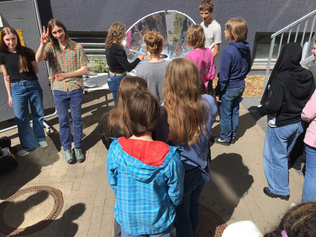 „Nur noch zwei Stück übrig!“, zeigt Rasmus C. mit eindeutiger Geste an. Tatsächlich fanden die Solar-Falafel bei der am Donnerstag von der Energie-AG durchgeführten Aktion reißenden Absatz. Trotz des kalten Nordwindes heizte die Sonne die Pfanne im Zentrum des großen Solarspiegels so sehr auf, dass der eine oder andere Abnehmer, der von der Seite her
