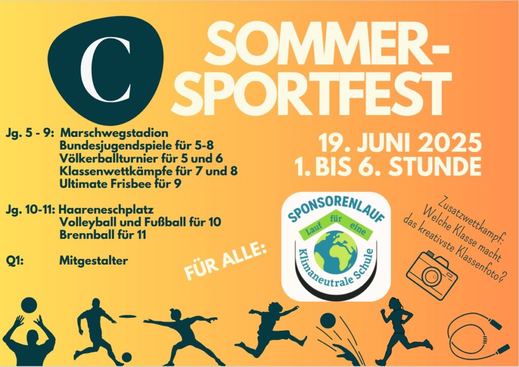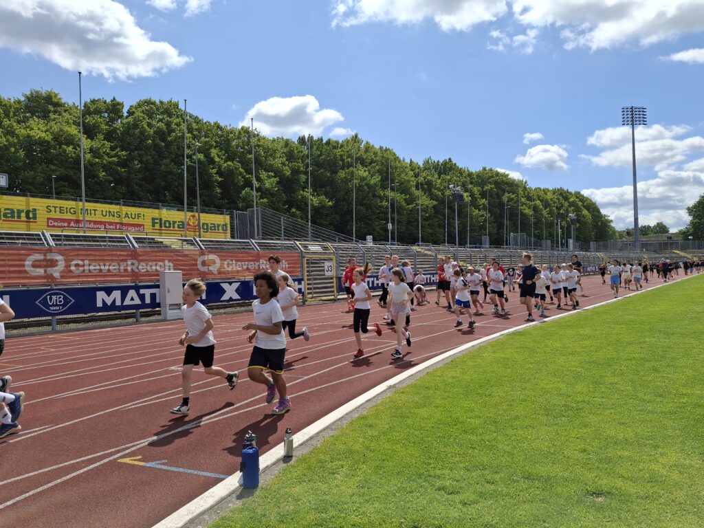 Wie funktioniert der Lauf?Im Rahmen des Sportfestes haben unsere Cäci-Schüler*innen von 12:15 bis 13:15 Uhr Zeit, so viele 400m-Runden zu drehen, wie sie können. Die Kinder wählen ihr Tempo selbst, auch Gehen ist erlaubt.Die gelaufenen Runden werden von unserem Organisationsteam, bestehend aus Lehrer*innen und Schüler*innen des 12. Jahrgangs, gezählt und auf dem Laufzettel vermerkt. Die