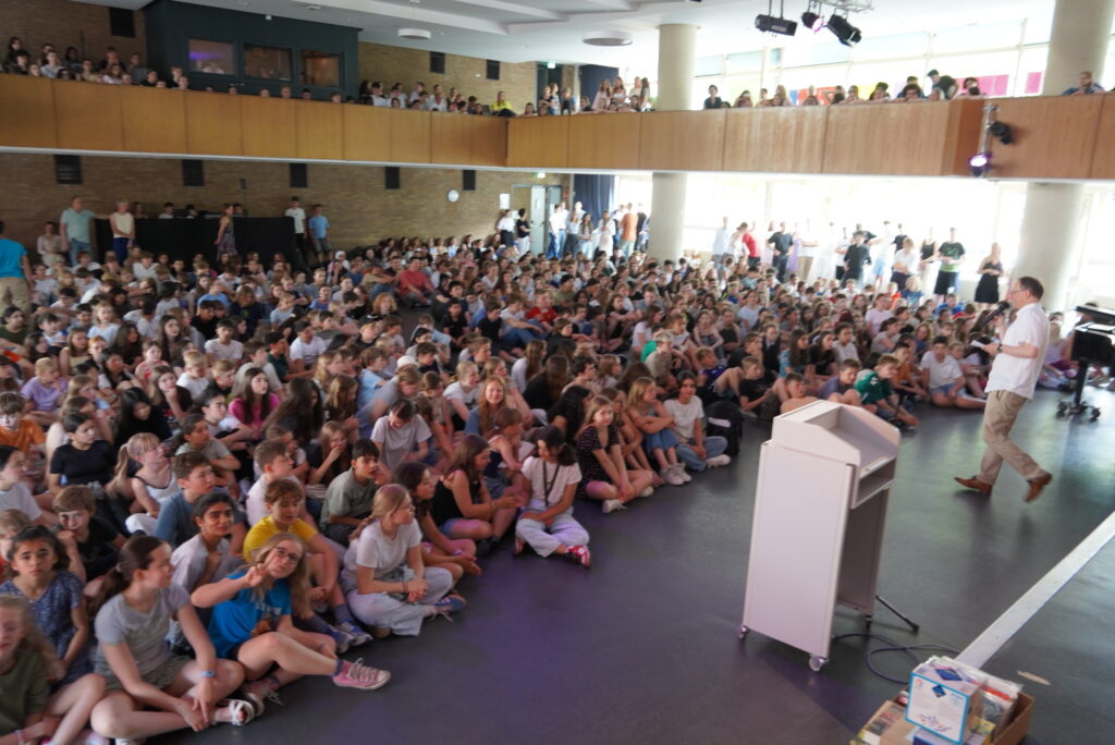 Letzter Schultag, Zeugnisausgabe, ab in die Sommerferien an einem glutheißen Tag. Doch dazwischen gibt es noch besondere Momente: in der ersten Stunde haben viele Klassen und Kurse zum Abschluss gefrühstückt und gespielt, in der Aulaveranstaltung in der 2. Stunde wurden Schülerinnen und Schüler für besondere Leistung geehrt (z.B. Deutsches Sprachdiplom, Känguru-Wettbewerb, Informatik-Wettbewerb, Jugend trainiert für
