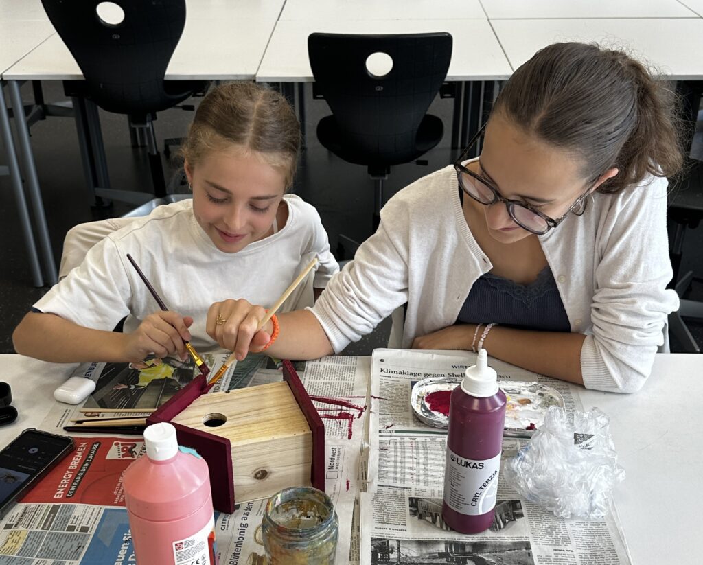 Am vergangenen Freitag hat sich die Dobbenhof-AG kreativ ausgetobt: Gemeinsam haben wir viele bunte Vogelhäuser bemalt, die schon bald im Pausenhof aufgehängt werden. Mit der Aktion wollen wir gleich zwei Dinge erreichen: Zum einen freuen wir uns, den Vögeln einen geschützten Nist- und Schutzplatz bieten zu können, gerade jetzt, wo die kältere Jahreszeit näherrückt. Zum