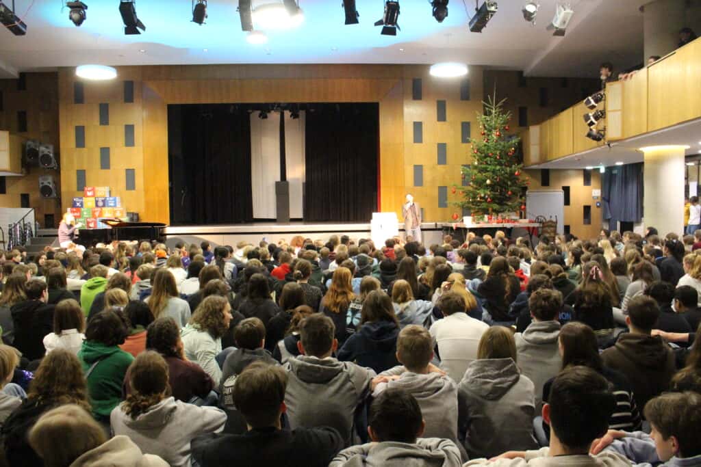 Wir verabschieden uns vom alten Jahr und feiern Weihnachten traditionell mit einer Aulaveranstaltung und allen 1.000 Schülerinnen und Schülern und dem gesamten Kollegium. Vertraute Elemente sind dabei, die aber jedes Jahr wieder schön sind und immer wieder neu wirken, da andere Schülerinnen und Schüler sie präsentieren. Gastschüler berichten von Weihnachtstraditionen in ihren Heimatländern, in diesem