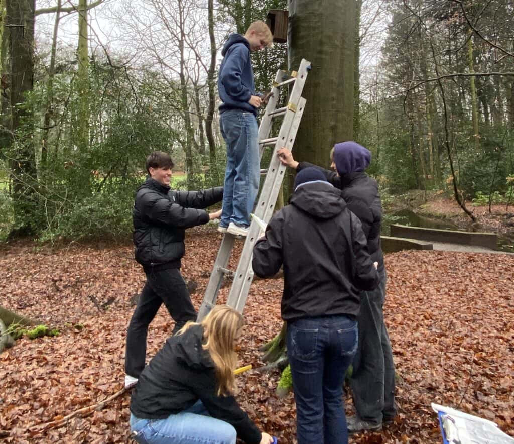 Für die Schülerinnen und Schüler des Biologiekurses von Fr. Dr. Gralher-Krengel ging es nach einer Einweisung durch die Freunde des Eversten Holzes e.V. bei der Reinigung von Nistkästen hoch hinaus. Gar nicht so einfach, in etwa drei Metern Höhe die unterschiedlichen Nistkastentypen zu vermessen, zu öffnen und dann altes Nistmaterial und andere Hinterlassenschaften des vergangenen