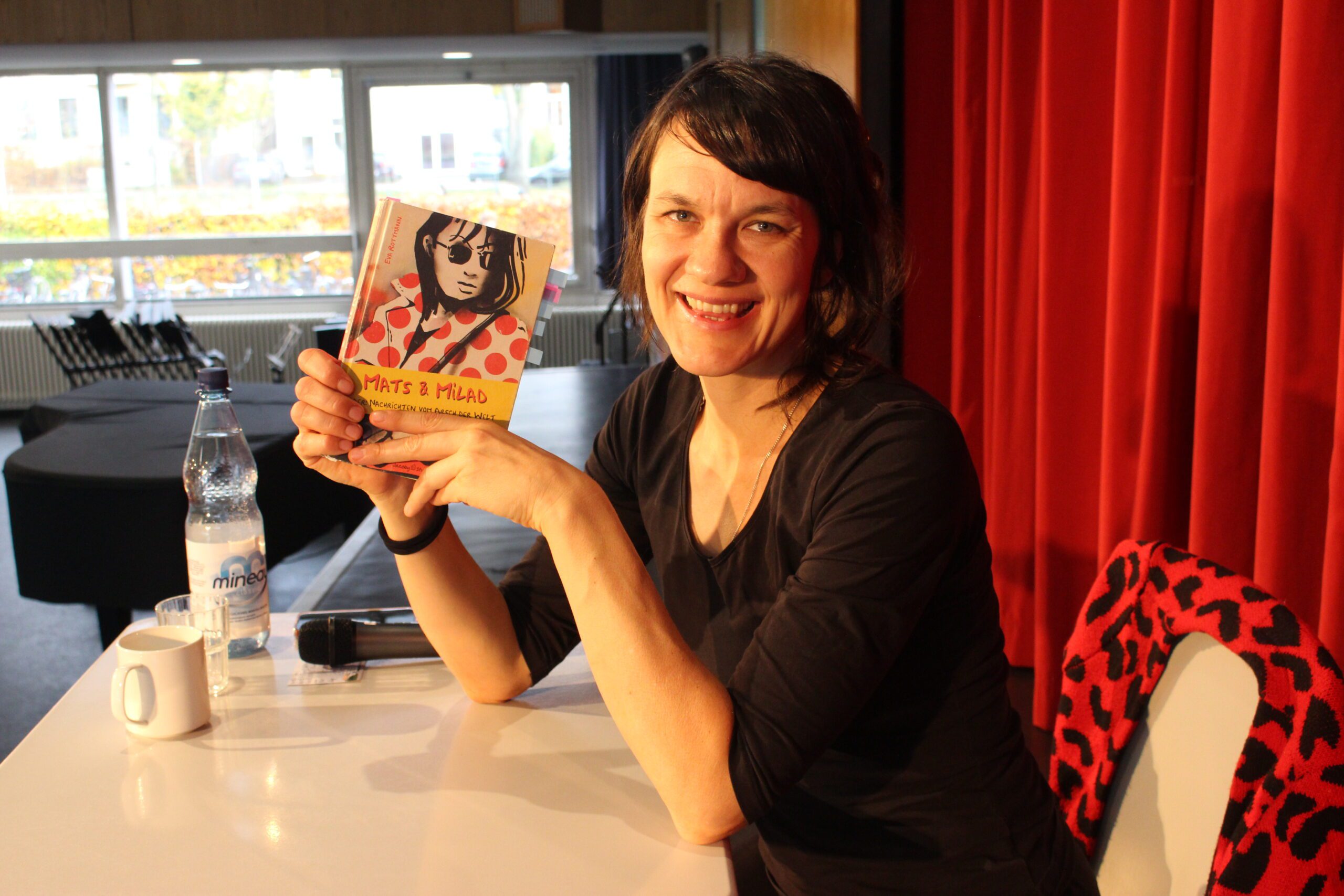 Welch ein Luxus (zumal bei diesem Wetter): Die KIBUM kommt ins heimische Wohnzimmer! Auf schulischer Ebene heißt das: Die Lesung findet in der Aula statt. Heute durfen sich gleich vier Klassen aus den Jahrgängen 6 bis 8 über einen Besuch der Autorin Eva Rottmann freuen, die aus ihrem Roman „Mats und Milad“ vorlas. Dabei wechselte sie immer wieder zwischen Phasen des Vorlesens und Phasen der Fragerunde mit dem Publikum, das sich dann durchaus neugierig zeigte: Seit wann sie bereits schriftstellerisch tätig sei, wie lange sie an einem Buch arbeite, wie viel sie dabei verdiene, wie der Vorgang der Veröffentlichung ablaufe – aber auch nach dem Lieblingsessen wurde gefragt. Mit „Mats und Milad“ verarbeitet Eva Rottmann auch persönliche Gedanken zu rechtsradikalen Aktionen gegen Flüchtlinge 2015, stellt aber die Liebesgeschichte zwischen den beiden Jugendlichen in den Mittelpunkt. Doch Milads Eltern kommen aus dem Libanon, und an dieser Stelle treffen sich beide Themen. Gespannt hörten die etwa 120 Schülerinnen und Schüler Eva Rottmann zu und genossen ihre ausdrucksstarke Vortragsweise und ihre lockere Art in der Gesprächsrunde. In Nachgesprächen wurde zudem deutlich: Das Interesse ist geweckt, einige Jugendliche (und Lehrkräfte) möchten den Roman gerne ganz lesen und schlagen ihn als Unterrichtslektüre vor; dazu wurden bereits entsprechende „Verhandlungen“ mit den Deutschlehrkräften aufgenommen.