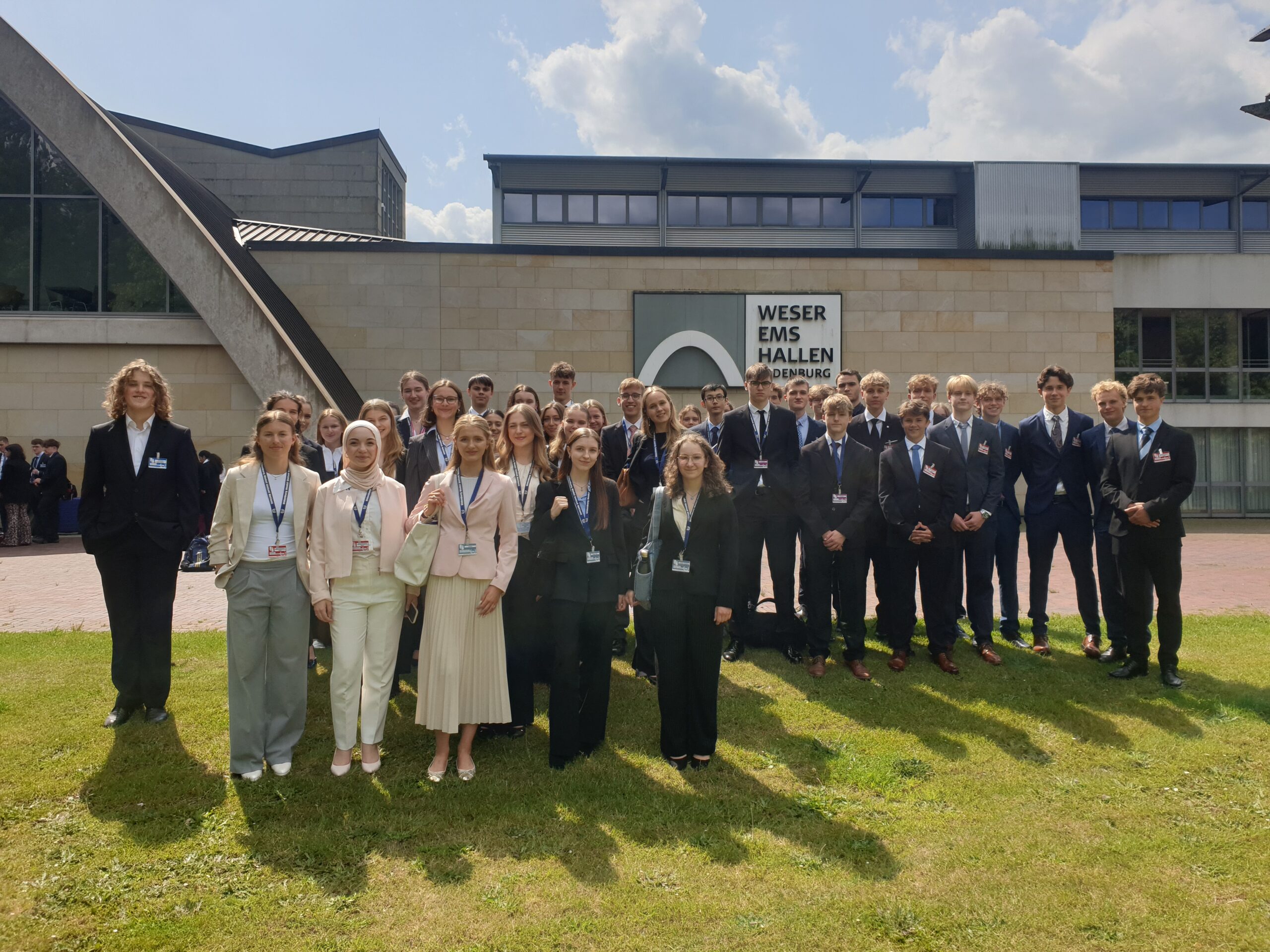Unter dem Motto „The Quarter of a Century – From Aspirations to Reality“ und mit einer Rekordteilnehmerzahl von Teilnehmerinnen und Teilnehmern von 1100 Personen ist die OLMUN (Oldenburg Model United Nations) 2025 gestartet. Svenja Hahn, Mitglied des Europäischen Parlaments und Präsidentin des Dachverbandes der liberalen Parteien im EU- Parlament, begrüßte als Schirmherrin der Veranstaltung die Teilnehmerinnen und Teilnehmer in der Weser-Ems Halle. Federführend geleitet von den Cäcilienschülerinnen Emily Roshop und Jannika Ebel und unterstützt von zahlreichen weiteren Schülerinnen und Schüler unserer Schule, darunter auch Ehemalige, werden die Delegierten bis Freitag versuchen, Lösungsansätze für drängende politische und soziale Themen zu erarbeiten. Die Konferenzsprache des großen Simulations- und Planspiels ist hierbei Englisch. Die Schülerinnen und Schüler tagen dabei in zahlreichen Gebäuden der Stadt – und natürlich auch mit zwei Komitees in unserer Cäci.