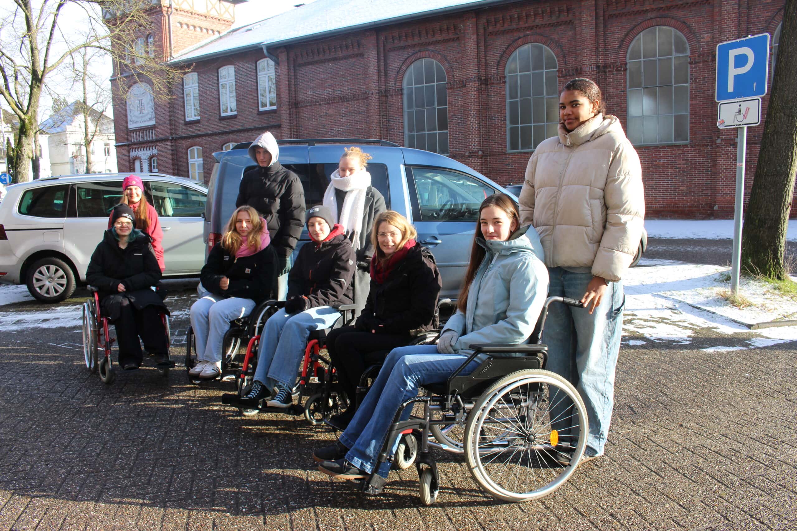 Im Anschluss vertieften die Schülerinnen und Schüler die Frage nach Menschen am Rande der Gesellschaft ganz unterschiedlich: Eine Gruppe setze sich beispielsweise mit dem Bürgergeld auseinander und überprüfte in einem Supermarkt konkret, inwieweit eigene Einkaufsvorlieben mit einem Budget des Bürgergeldes vereinbar wären, andere Gruppen überlegten, welche Rolle die Sprache bei Inklusion oder auch Ausgrenzung spielen kann und besuchten dafür einen Vortrag beim DRK. Eine Gruppe setzte einen historischen Schwerpunkt und besuchte die Gedenkstätte „Alte Pathologie“ in Wehnen, eine andere wurden künstlerisch aktiv und gestaltete Zeichnungen und Skulpturen. In einigen Workshops waren Externe zu Gast, beispielsweise eine Rollstuhlfahrerin, die aus eigener Erfahrung und aufgrund ihres Engagements im Behindertenbeirat sehr versiert zum Thema Barrierefreiheit mit den Jugendlichen arbeiten konnte. Besonders interessant war der praktische Teil dieses Workshops, als die Schülerinnen und Schüler selbst einmal ausprobieren durften, mit welchen alltäglichen Schwierigkeiten man mit einem „Rolli“ zu kämpfen hat. Kleine Unebenheiten auf dem gepflasterten Weg zum Dobbenhof, eine niedrige Metallkante an der Tür zum Foyer oder das Kopfsteinpflaster zwischen Bürgersteig und Straße am Haarenufer waren den Jugendlichen bisher kaum aufgefallen, stellten jetzt aber auf einmal echte Hindernisse dar, und die vorhandene Rampe erwies sich als erstaunlich steil.