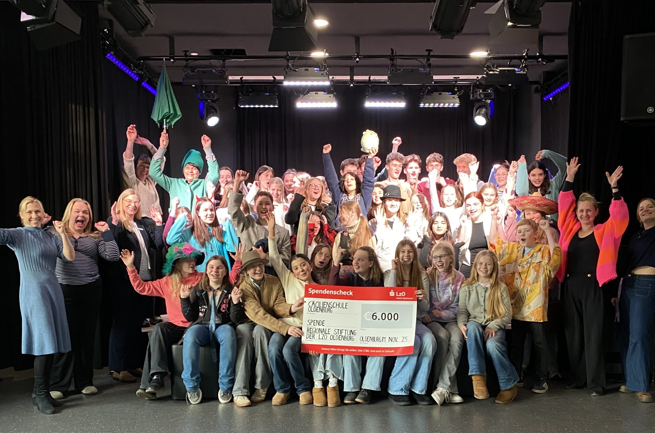 Frau Pagel, stellvertretende Leiterin der LzO-Filiale am Schlossplatz, hat es sich nicht nehmen lassen, den großen Scheck über eine Summe von 6.000 Euro selbst in die Cäci zu bringen und den Lehrkräften und Schülerinnen und Schülern aus den Kursen des Fachs Darstellendes Spiel und der Musical-AG für die Planung und Ausrichtung dieses großen Projekts alles Gute zu wünschen. Das Cäci-Organisations-Team für das NiST 2026, bestehend aus Frau Adler-Rouwen, Frau Burchards und Frau Dr. Gralher-Krengel, freut sich sehr über die Unterstützung. Bis sich der Vorhang für die feierliche Eröffnung des Schultheatertreffens hebt, gibt es nämlich noch jede Menge zu tun. Umso wichtiger ist es, mit der Regionalen Stiftung der LzO eine engagierte Partnerin an der Seite zu wissen. Ein zusätzlicher Gewinn: Anschaffungen, die aus dem Fördergeld finanziert werden, verbleiben dauerhaft an der Schule und kommen damit der gesamten Schulgemeinschaft auch über das Schultheatertreffen hinaus zugute.