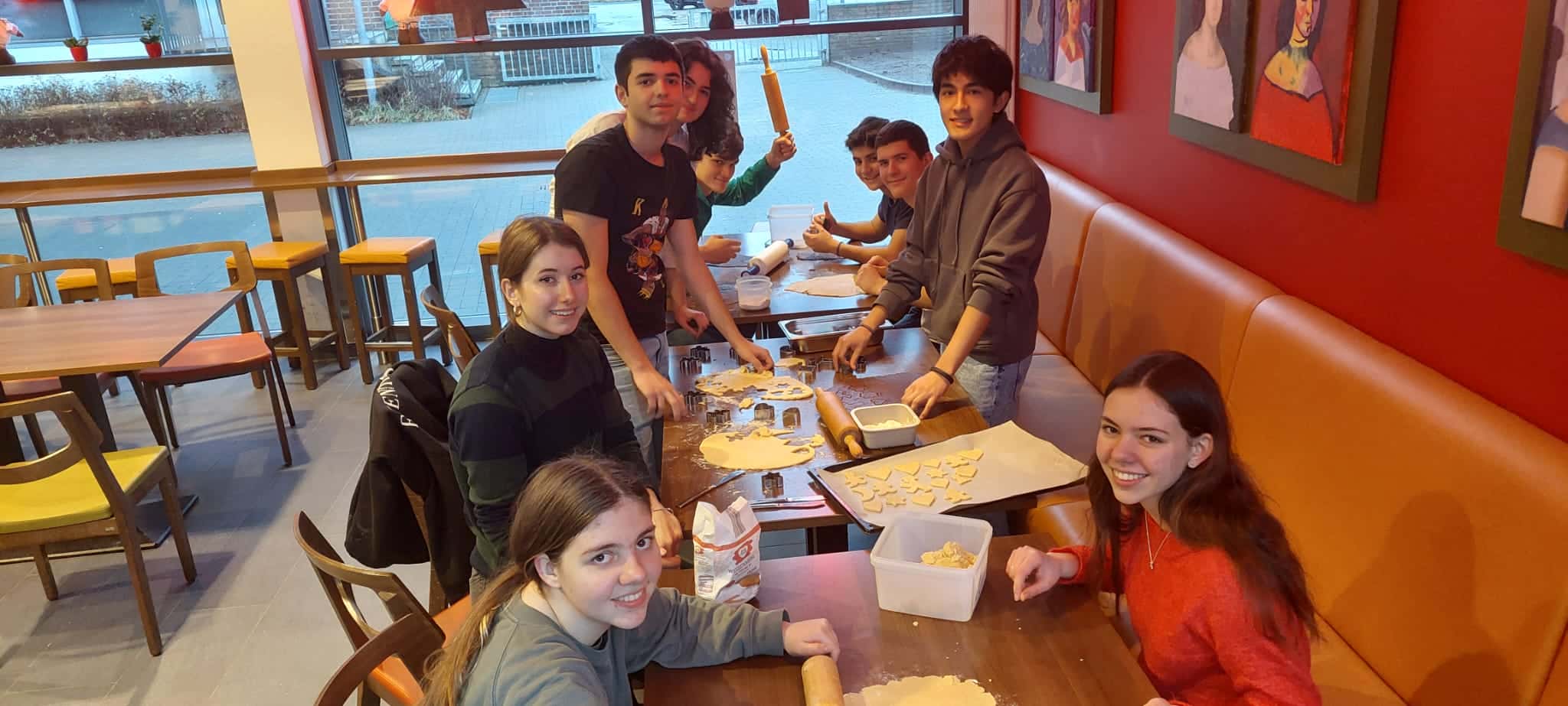 Wer sagt, dass man Kekse nur in der Weihnachtszeit backen und essen mag? Eben! Unsere Gastschülerinnen und Gastschüler sehen das offensichtlich genauso und verlebten gestern einen schönen Nachmittag mit Frau Lüttke und Petra in der Cäciteria. Drinnen war es warm, hell, freundlich und alles duftete wunderbar, während es draußen dunkelte, immer wieder fieselte, regnete oder im besten Falle sanft schneite. Da schmecken selbstgebackene Kekse doch besonders gut!