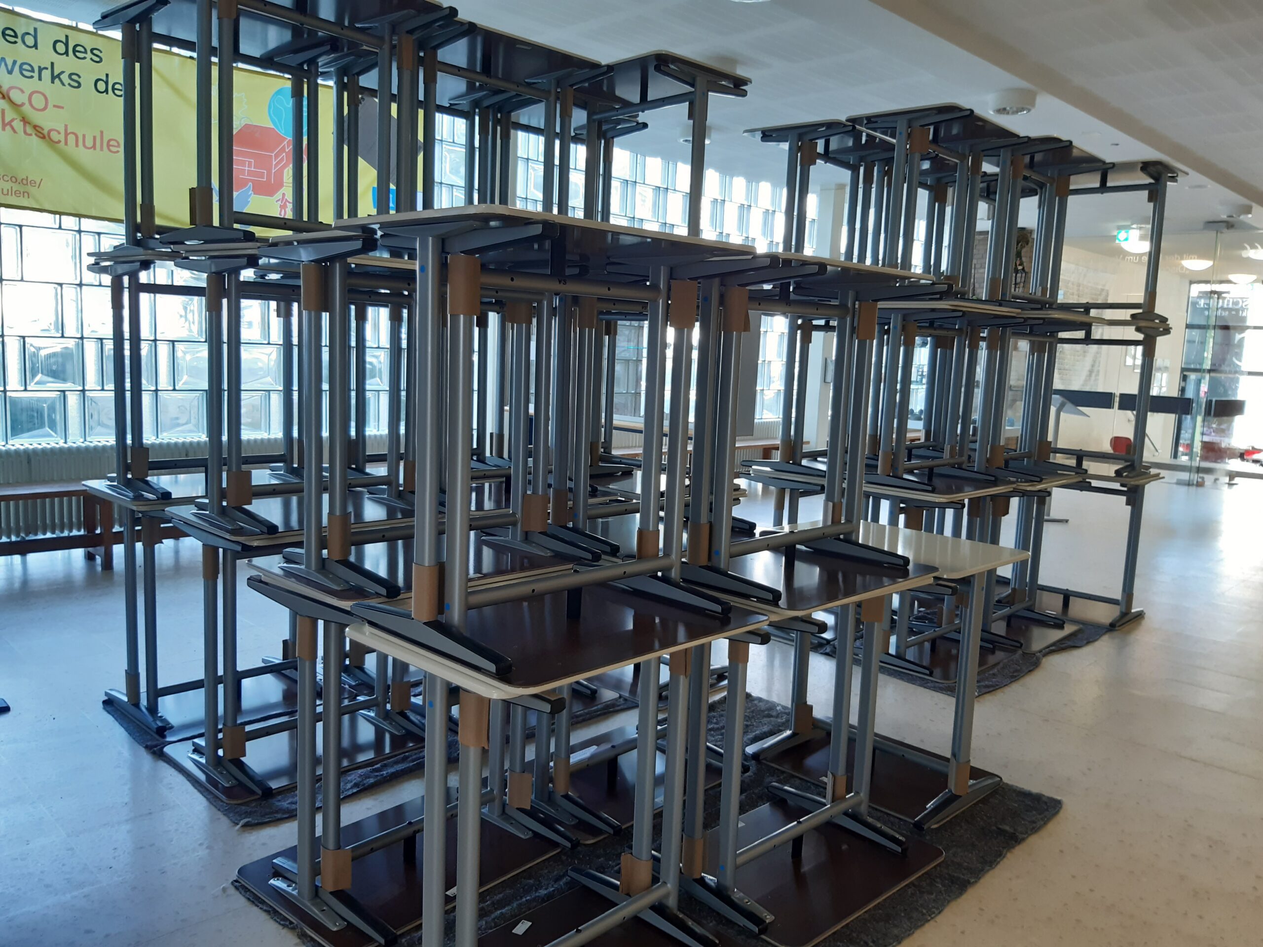 Ist das eine Ausstellung für moderne Kunst im Foyer? Was könnte sie darstellen? Die Auflösung des Rätsels: Es handelt sich um neues Mobiliar, das am Freitag geliefert und u.a. in Raum 1.14 transportiert wurde. Dieser Raum erstrahlt jetzt – wie viele andere Räume auch – nach der Renovierung, mit neuer Multifunktionstafel und neuen Tischen und Stühlen in frischem Glanz.