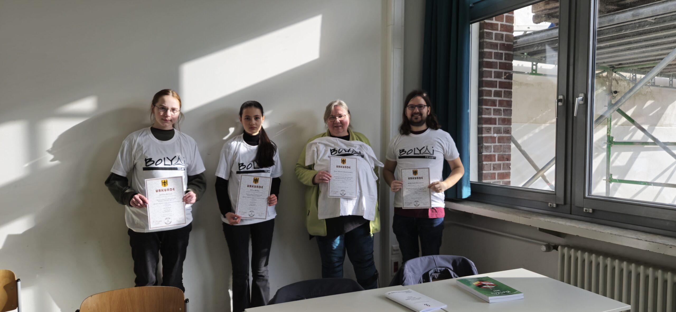 Mit sieben Teams haben wir im Januar am Bolyai-Teamwettbewerb teilgenommen. Dabei geht es darum, im Team mit bis zu vier Schülerinnen und Schülern innerhalb einer Stunde arbeitsteilig und kooperativ 14 verschiedene Problemstellungen zu lösen. Das Team mit Nyla Beske, Johanna Wiefering, Jonte Rohmeyer und Jonna Kluge hat für Jahrgang 8 teilgenommen und deutschlandweit den 4. Platz erreicht. Damit bekamen sie besondere Urkunde und einen kleinen Preis zugeschickt. Die anderen Teams erreichten ebenfalls Plätze in den Top 50 ihrer Jahrgansstufe bei jeweils etwa 1000 teilnehmenden Teams und damit eine Urkunde zur erfolgreichen Teilnahme. Herzlichen Glückwunsch!