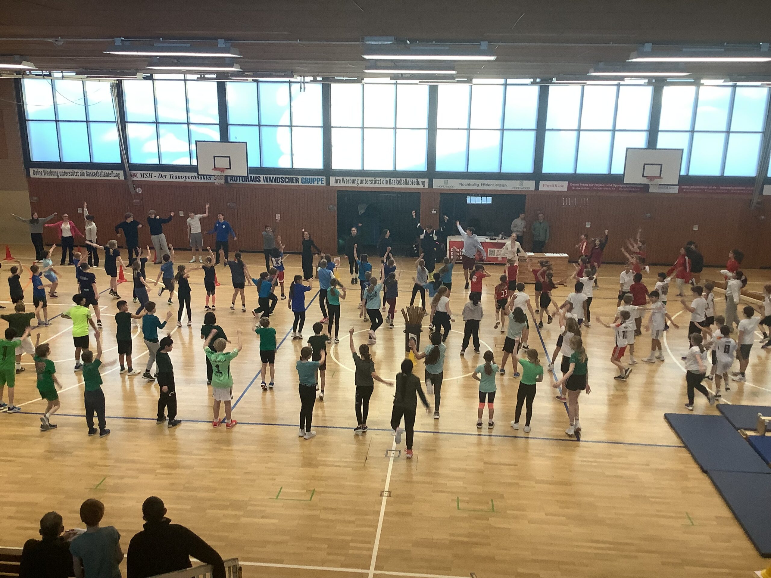 Im Bereich Leichtathletik treten Einzelpersonen gegeneinander ein, bei unserem Sport- und Spielefest für Jahrgang 5 ging es im Gegenteil um Zusammenarbeit, um Kooperation statt Konkurrenz, auch wenn am Ende eine Siegerklasse gekürt wird. Begleitet wurden viele Klassen von ihren Vertrauensschülerinnen und -schülern und natürlich von ihren Lehrkräften, die nicht von der Tribüne aus jubelten, sondern auch selbst einige der Geschicklichkeitsübungen ausprobierten.