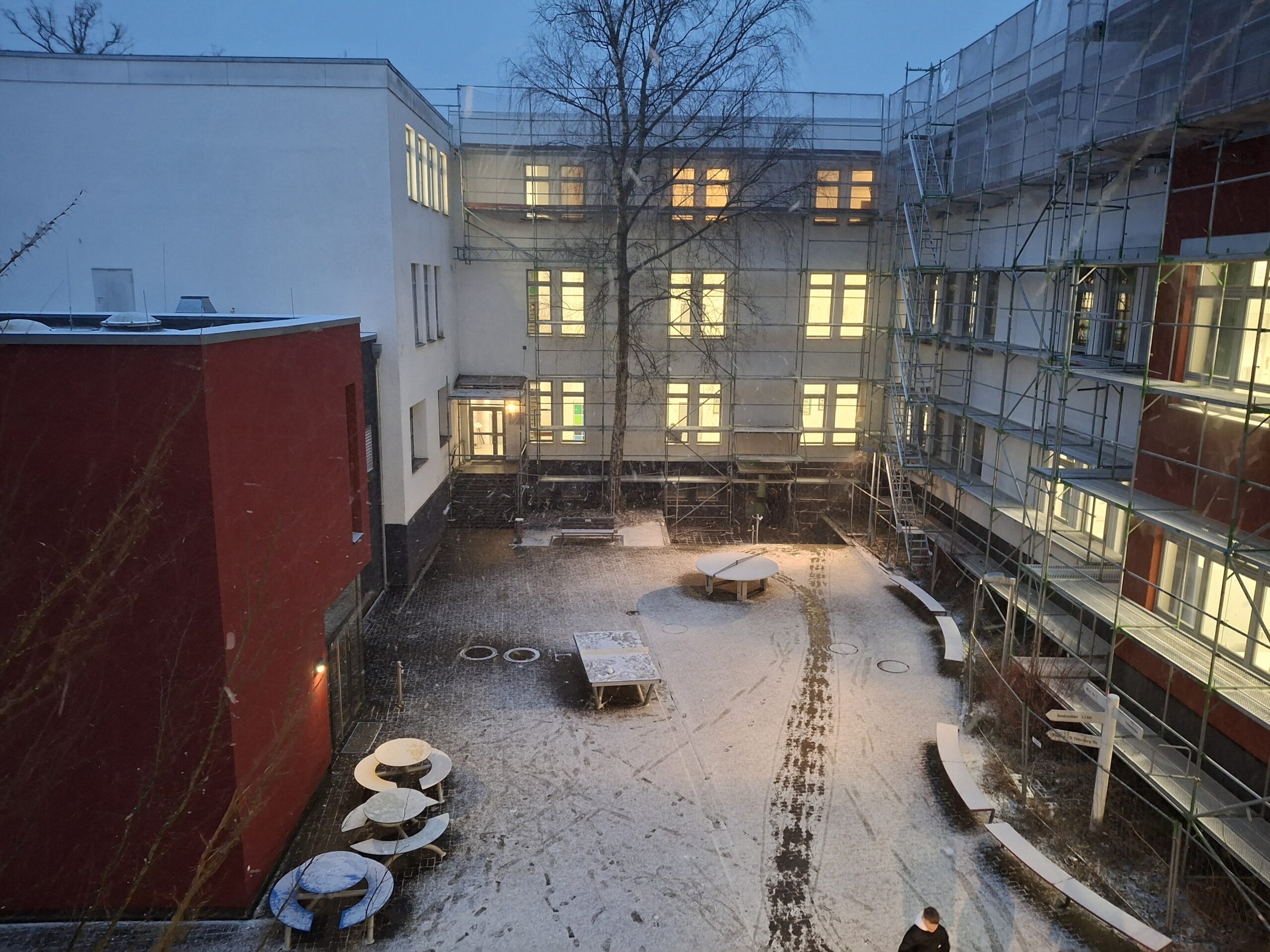 Von richtig viel Schnee konnte man heute natürlich nicht sprechen, aber da wir mittlerweile diesbezüglich bescheiden geworden sind, konnten wir uns heute über die ein bis zwei Zentimeter richtig freuen. Die Schneeschippenden empfanden ihn wahrscheinlich weniger als Geschenk als die Ausdemfensterträumenden, aber auf jeden Fall schuf der Schnee vor Sonnenaufgang eine zauberhafte Atmosphäre und manch Hereinkommendem eine kurzzeitige Kopfbedeckung à la Schneekönigin bzw. Schneekönig.