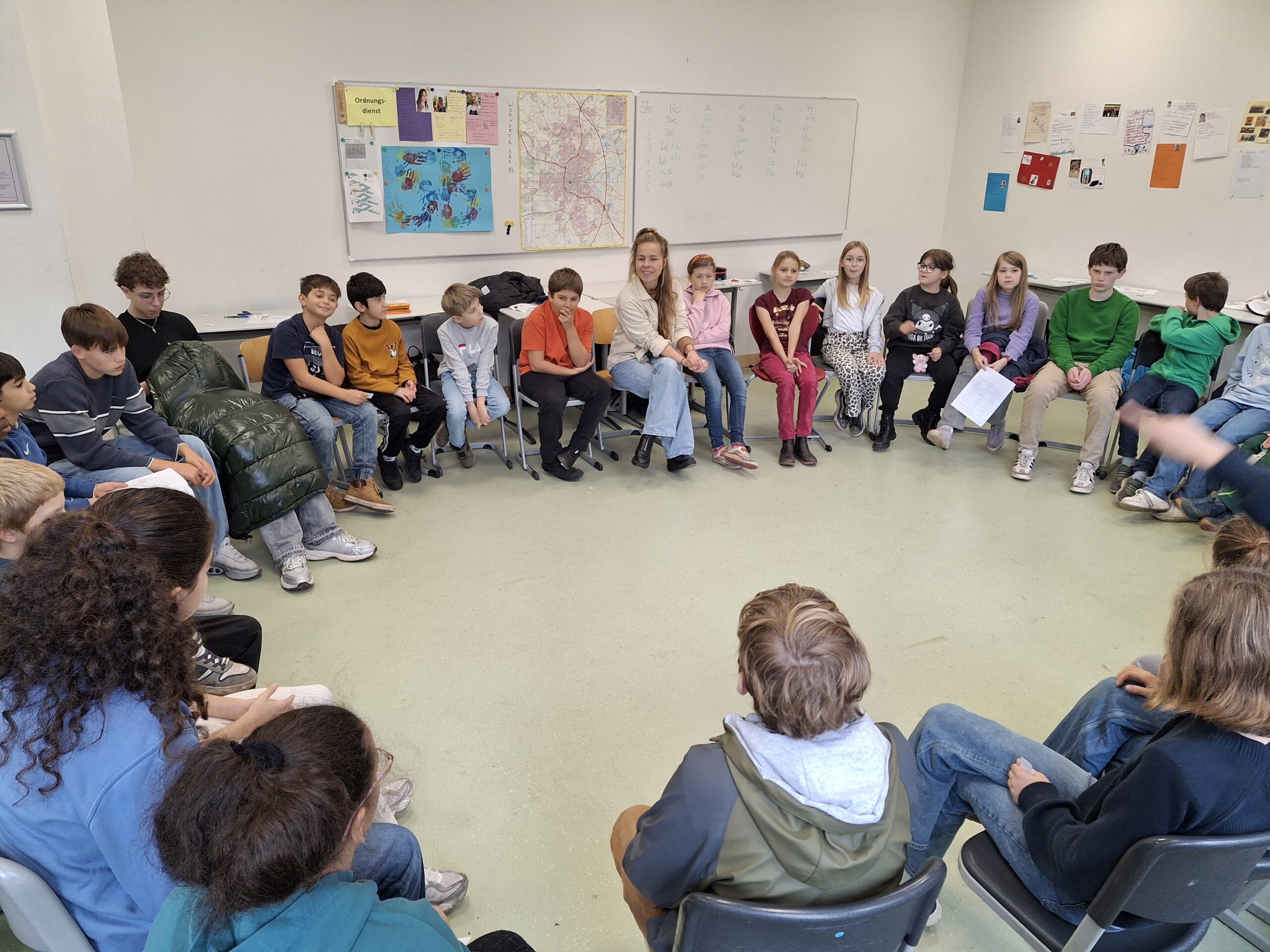An der Cäci nehmen wir uns diese Zeit! Die neuen Klassen 5 gehen auf Wandertag in den Wald und absolvieren ein Teamtraining, auf der Fahrt zum Blockhaus Ahlhorn lernen sich alle besser kennen, und einmal im Monat gibt es mitten im Schulalltag für die Klasse 5 und 6 eine große Portion Extrazeit für „Soziales Lernen“. Dann werden im Klassenzimmer Tische und Stühle beiseite gestellt oder die Gruppe geht sowieso auf den Dobbenhof und trainiert unter Anleitung ihrer Vertrauensschülerinnen und -schüler mit Spielen Achtsamkeit für die Bedürfnisse von anderen, Teamfähigkeit und Kommunikation. Und Spaß macht das Ganze noch zusätzlich, wenn beispielsweise „Samurai“ und „Tiger“ sich begegnen, die „Großmutter“ aber beim „Samurai“ die Oberhand behält.